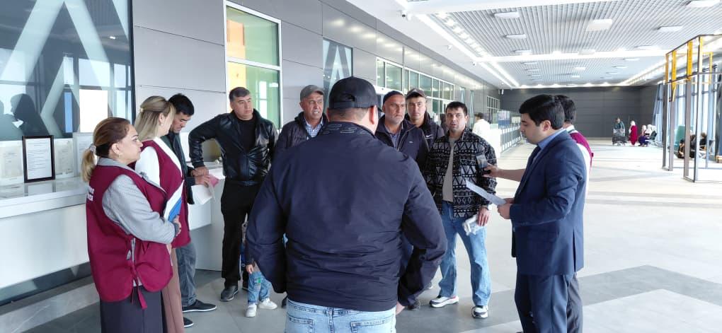 Бонувони Хадамоти муҳоҷират бо як ҳисси баланди масъулиятшиносӣ дар “Фурудгоҳи байналмилалии шаҳри Душанбе” корҳои фаҳмондадиҳиро дар байни муҳоҷирони ба ватан бозгашта ҷоннок намуда истодаанд.