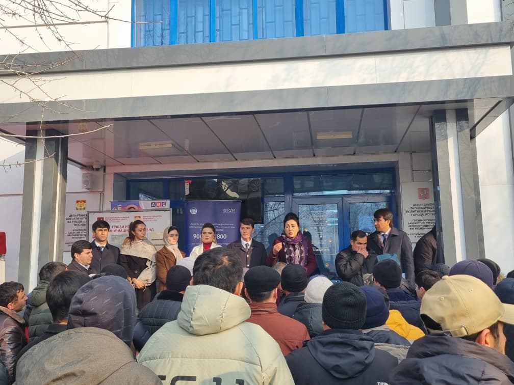 Кормандони дастгоҳи марказии Хадамоти муҳоҷират ва МД “Марказҳои машваратӣ ва омодагии пеш аз сафари муҳоҷирони меҳнатӣ” дар шаҳри Душанбе дар ҳамкорӣ бо Созмони байналмилалии муҳоҷират (СБМ) дар Тоҷикистон дар назди Маркази сершуғли муҳоҷират, вохӯрии судмандро бо шаҳрвандони ҷумҳурӣ, ки барои супоридани имтиҳон ва гирифтани сертификат аз забони русӣ, таъриху тамаддун ва қонунгузории Федератсияи Россия омадаанд баргузор намуданд.